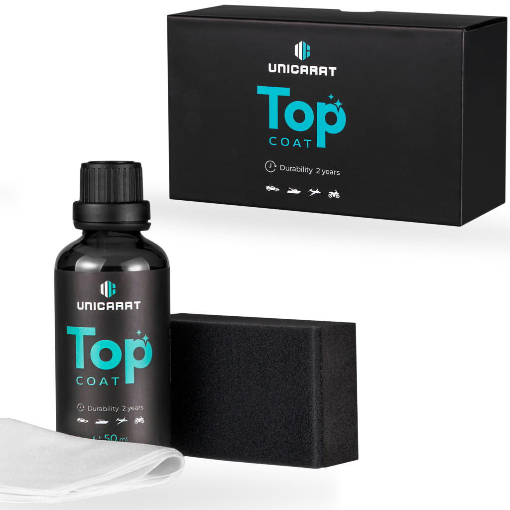 Das UNICARAT Top Coat sorgt für das perfekte Finish. Es handelt sich um eine harte Versiegelung, die 4-6 Stunden ( je nach Umgebungstemperatur ) nach der Anwendung von UNICARAT 9H Ceramic Coating oder UNICARAT Graphene Coating aufgetragen wird. Es verleiht der Oberfläche zusätzlichen Glanz und sorgt für eine sehr glatte Oberfläche. Zudem verlängert es die Haltbarkeit der darunter liegenden Versiegelung um bis zu 2 Jahre.